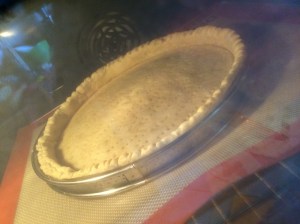 Placer une feuille de papier cuisson sur le fond de la tarte et le recouvrir de haricots secs ou de billes en céramique et cuire la pâte à blanc (càd cuire la pâte sans garniture) pendant une quinzaine de minutes. Il faut que les bords commencent à dorer.