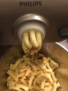 La machine mélange tout elle-même et les pâtes commencent à sortir de la machine au bout de 3 minutes. Il suffit alors de les couper à la longueur que l’on souhaite au fur et à mesure qu’elles sortent de la machine.